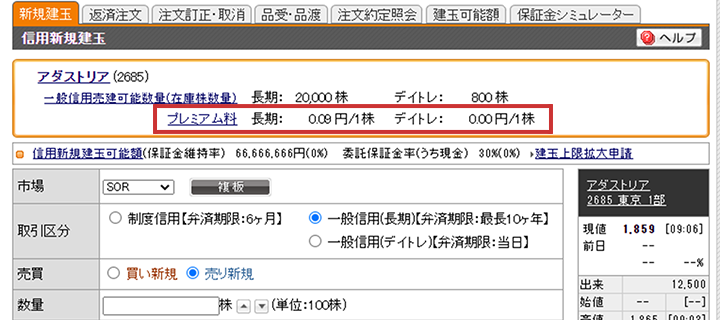 プレミアム料付空売りとは、プレミアム料を支払うことで一般信用(長期・デイトレード信用取引)で空売り(新規売建)ができるサービスです。