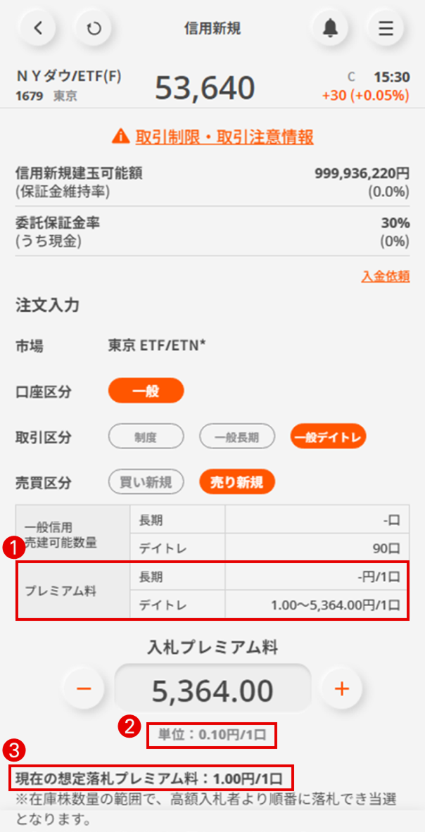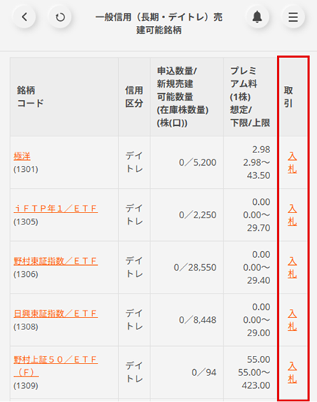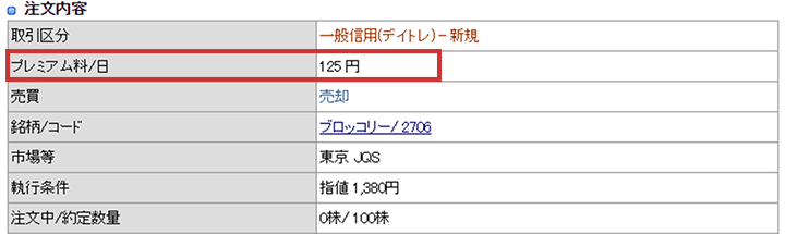 - 当該方法で採用されたプレミアム料は、一般信用取引(長期)の場合、銘柄ごとに1日につき1株当たりの価格が日次で更新されます。一般信用取引(デイトレード信用取引)の場合、銘柄ごとに1日につき1株当たり当社が計算した価格を基準として入札方式により日次で決定します。銘柄ごとの日々のプレミアム料は、当社お取引画面(一般信用売建可能銘柄一覧)や新規建発注画面等で最新情報をご確認ください。