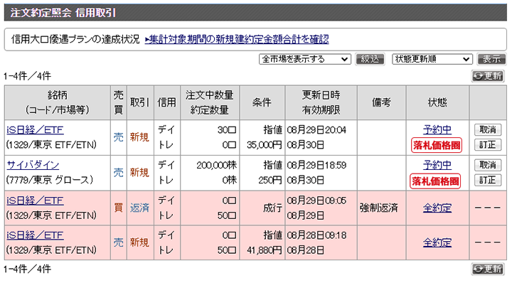 翌営業日分の一般信用(長期)の売建可能銘柄の抽選申込みを19:30~20:30に受け付けています。
