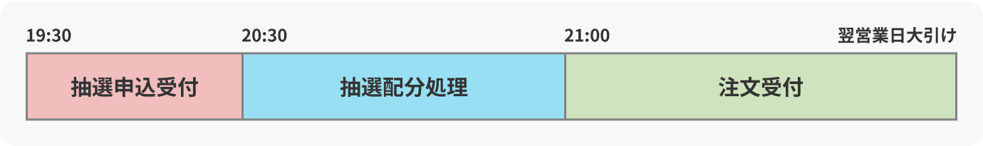- 抽選配分処理時間となる20:30から21:00は注文受付不可時間帯になります。訂正・取消は可能です。