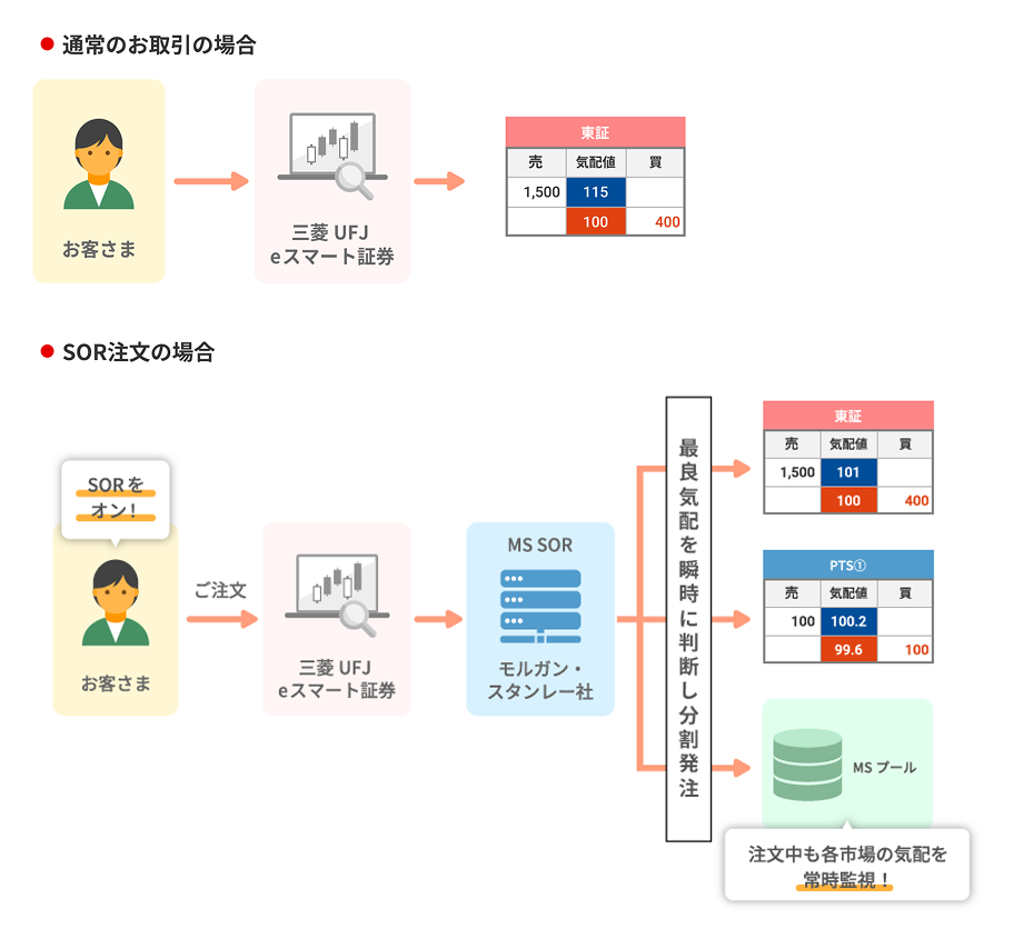 SOR(Smart Order Routing=スマート・オーダー・ルーティング)とは、複数の市場(取引所やPTSなど)の気配と出来高を比較し、より有利な価格(買い注文の際にはより安く、売り注文の際にはより高く)で約定できるよう自動で発注先を選ぶ仕組みです。 活用することで、価格改善効果が期待できるほか、発注スピードの向上、約定確率が上がる可能性があるなどのメリットがあります。設定は2ステップでかんたんに一括設定が可能です。