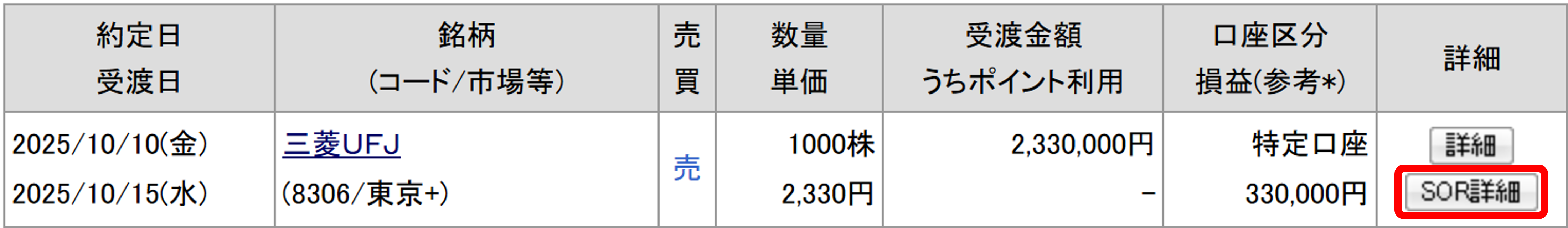 「資産管理」>「取引履歴」>「現物株式」または「信用」の画面の一番右側にある「詳細」の項目から、確認したい注文の「SOR詳細」ボタンを押下します。