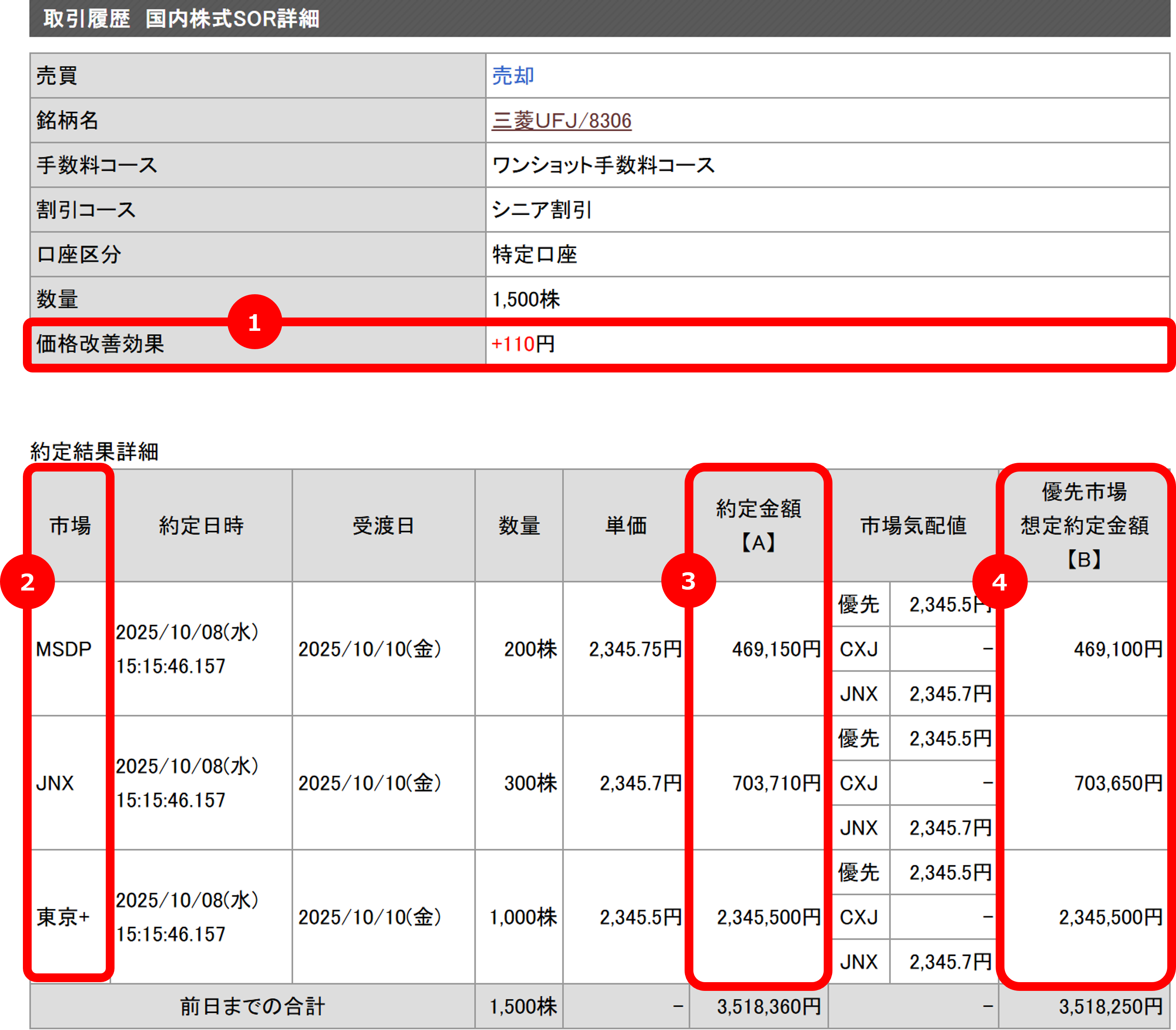 | SOR執行評価(全約定分) | SOR利用注文のうち、MSプール及びPTSでの約定に対する評価結果 |
