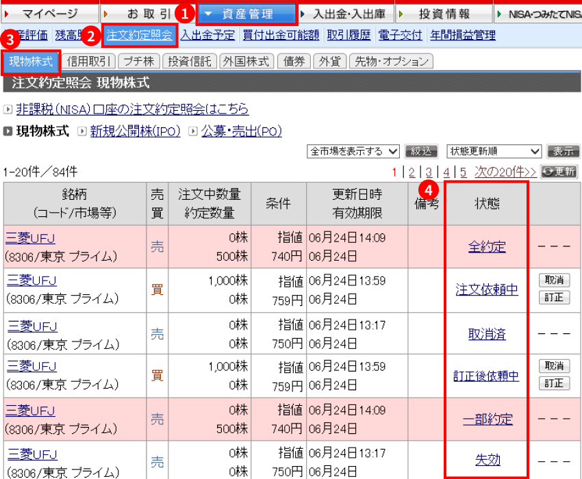 マイページにログイン後、上部メニューの①資産管理から②注文約定照会③現物株式を押してください。④状態の文字をクリックすると注文詳細をご確認いただけます。