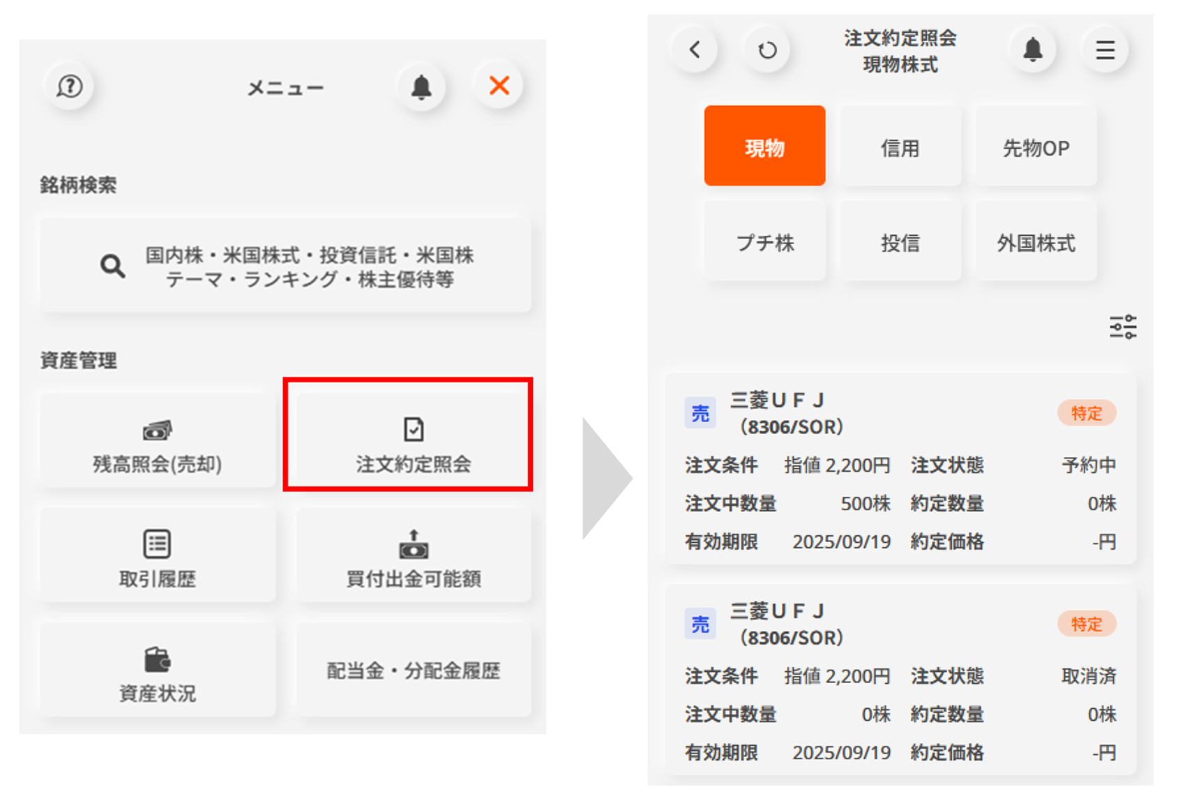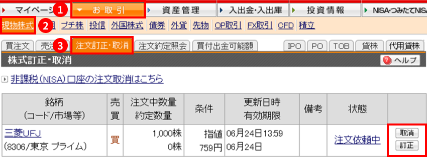 マイページにログイン後、①お取引から②現物株式をクリックし、③注文訂正・取消をご選択いただいてもご注文の訂正・取消注文が可能です。