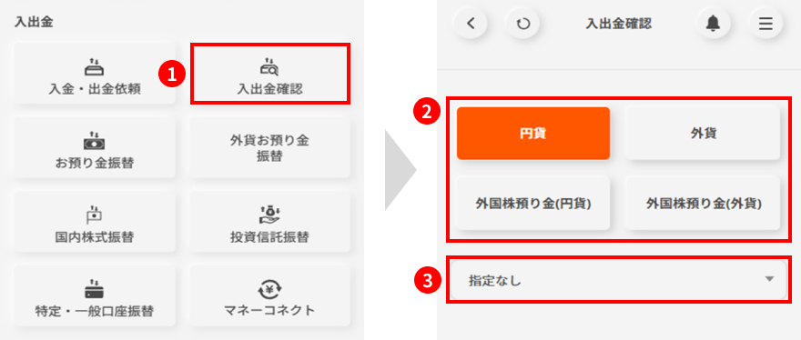 この画面では、「円貨」の入出金に加え、「外貨」および「外国株預り金(円貨・外貨)」の明細も確認できます。③部分で切替を行い、確認してください。