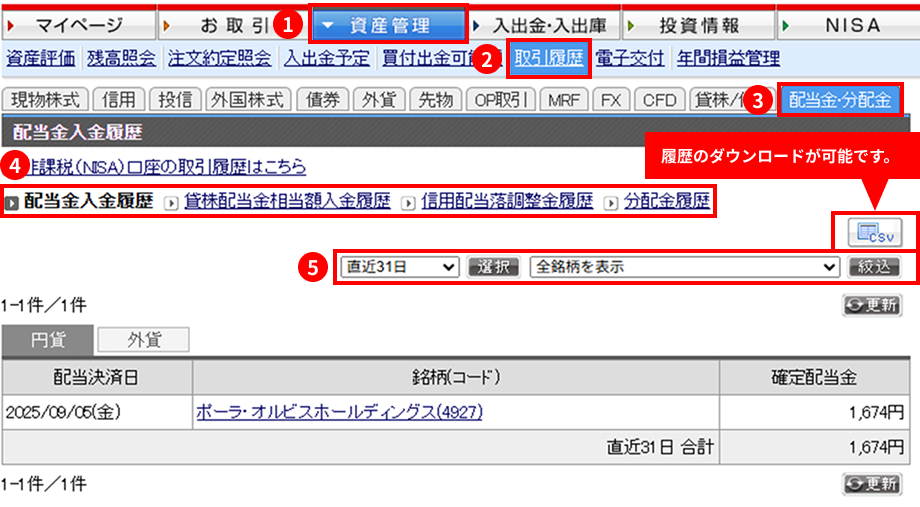 この画面では、配当金入金履歴以外にも、貸株配当金相当額入金履歴、信用配当落調整金履歴、分配金履歴がご確認いただけます。④部分で切替を行い、確認してください。