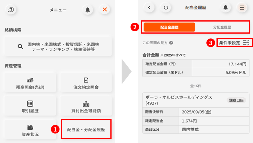 「③配当金・分配金」では、配当金・分配金の履歴をご確認いただけます。