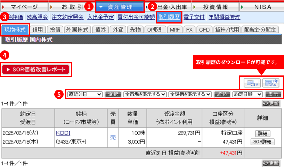 また、⑤では取引年月の選択や、市場や銘柄の絞り込み、表示順の変更が可能です。