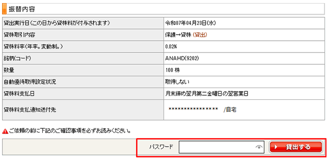 振替内容を確認、貸出申込み実行内容をご確認いただき、パスワードを入力の上「貸出する」ボタンをクリックします。