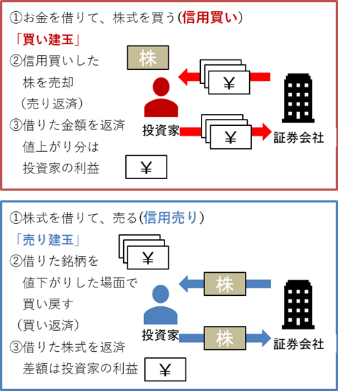 個人投資家の場合、信用買いは証券会社からお金を借りて株を買い、証券会社にお金を返して決済します。一方、信用売り(空売り)は、証券会社から借りた株式を市場で売り、株価下落を見計らって借りた銘柄を買い戻して証券会社に株式を返して決済します。