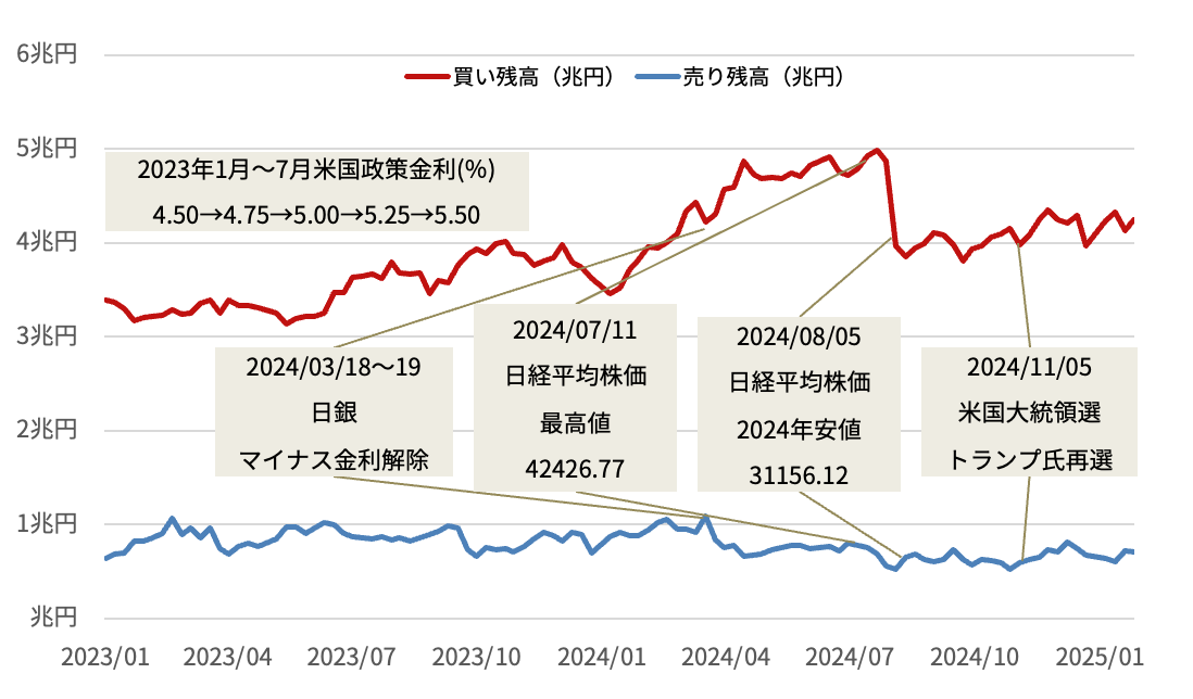主なニュースと照らし合わせると、信用残の増減も納得できるかと思います。2024年前半に日本株が好調だった時期は、買い残が徐々に増加していますね。7月下旬以降に株式市場が荒れた局面では買い残が急に減っています。