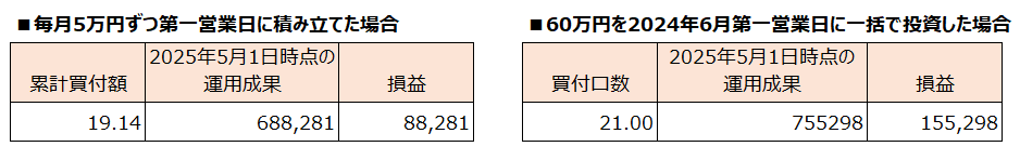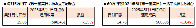 こちらのケースでは、60万円を12回に分けて投資するより、1回目の時点で60万円を一括投資していた方が、より利益を得られています。もちろん、タイミングや投資期間が変わることで異なる結果が得られる可能性もありますが、少なくとも、「ドルコスト平均法は必ずしも利益を最大化するものではない」ということがお分かりいただけるのではないでしょうか。