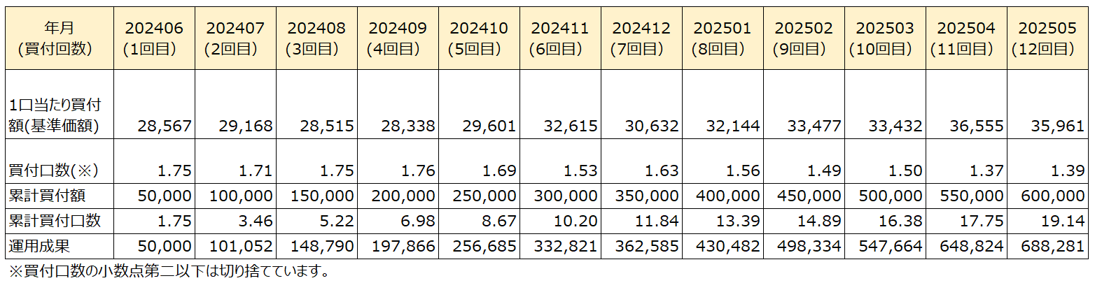 ドルコスト平均法の実際の効果を理解するために、シミュレーションを行います。ある投資信託のファンドを、1年間毎月第1営業日に5万円ずつを積み立てた例をお見せします。