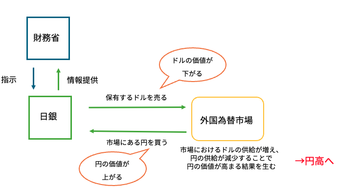 具体的には、円安が進みすぎている状況ではドルを売って円を買う「円買い・ドル売り介入」を行います。一方で、円高が進みすぎている状況では円を売ってドルを買う「円売り・ドル買い介入」を行います。