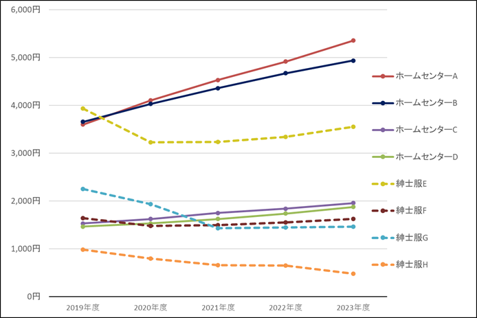 次のグラフでは、ホームセンターと紳士服量販店の代表的な企業のBPSについて、直近5年度分の推移を示しました。