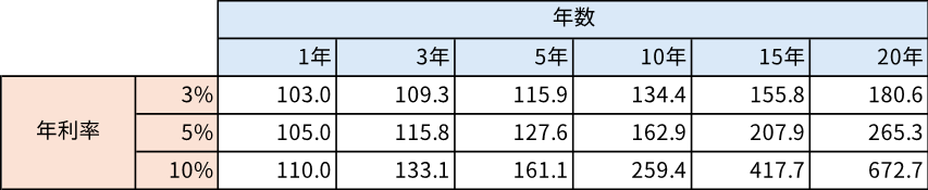 <100万円を一括投資した場合の将来の資産額>(単位:万円)