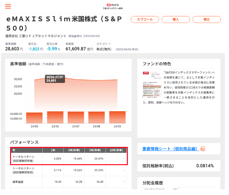 ファンドごとの成績は、ファンドの個別のページ内の「パフォーマンス」に記載されています。下図は、三菱UFJ eスマート証券のeMAXIS Slim米国株式(S&P500)の個別ページの画面です。赤枠の箇所がトータルリターン(信託報酬控除後)の数字です。投資家からすれば、信託報酬が差し引かれた後のものが実際の成果になるので、こちらの数字を見るとよいでしょう。