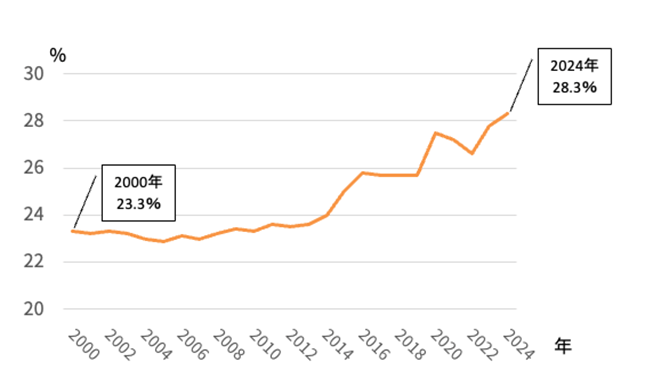 総務省家計調査によると、二人以上の世帯の2024年のエンゲル係数は、28.3%でした。