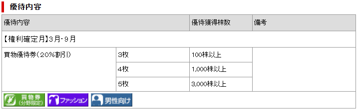 株主優待は、自社取扱商品(衣料品・雑貨)や自社子会社運営オンラインショッピングサイトにて利用可能な20%買物割引券(割引コード4回分)がもらえます。