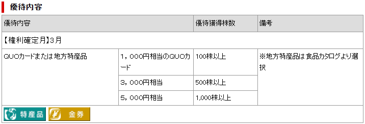 株主優待はオリジナルQUOカード、500株以上だと食品カタログから地方特産品がもらえます。好きな食品を選べるカタログは人気の優待品です。