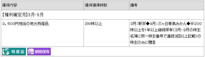 3月の株主優待は静岡県特産の「新茶」、9月は「三日青島みかん」がもらえます。200株以上を1年以上継続保有することが条件になっています。