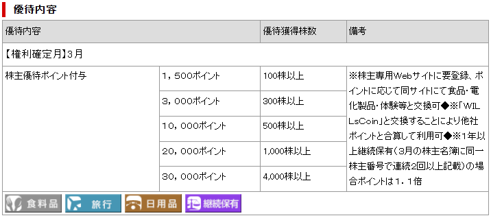 株主優待は、食品、電化製品、ギフト、旅行・体験など 2,000点以上の商品から選び、交換できるポイントです。株主専用Webサイトに要登録で、ポイントに応じて同サイトにて交換可能です。また、1年以上継続保有(3月の株主名簿に同一株主番号で連続2回以上記載)の場合ポイントは1.1倍になります。自分の好きなものを選べるということで人気の株主優待になります。