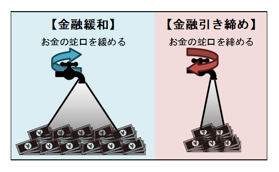 お金が流れにくくなり、放っておくとさらに景気が悪くなりそうな場合には、経済へのテコ入れが必要です。制約を緩めて世の中に流れるお金の量を増やし、企業や人々が「お金があるから買いたい」と思えるように促します。蛇口を緩めると水が大量に流れるように、政策で蛇口を緩めてお金が流れるようにするわけです。これが「金融緩和」です。