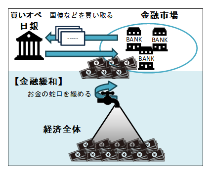 金融緩和とは、世の中で流れているお金の量を増やすことです。