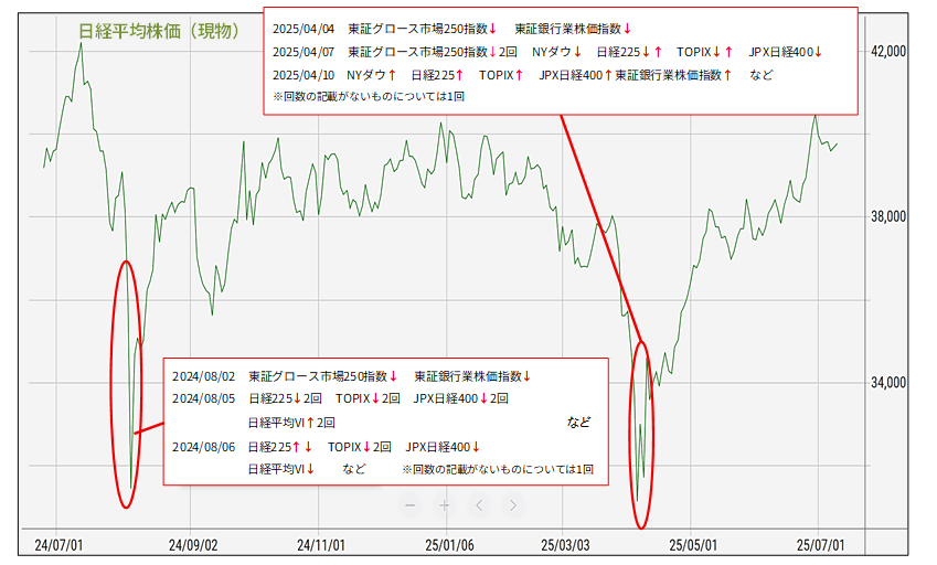 複数の先物取引にサーキットブレーカーが発動された2024年8月と2025年4月の株式市場は、日経平均株価(現物)のチャートに照らし合わせてみると、急激な動きを確認できます。