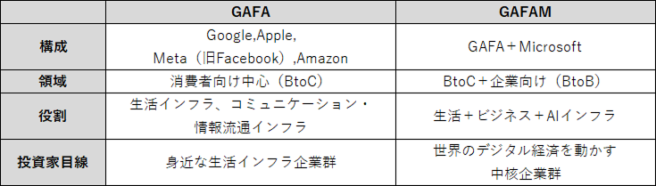 GAFAMとGAFAの違いは、GAFAにMicrosoftが加わったことで、"生活者中心"から"世界のデジタル基盤を支配する"企業群へと意味が拡大された点です。