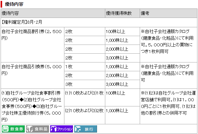 株主優待では、自社の食品・サプリメントなどの購入に利用できる割引券などが進呈されます。