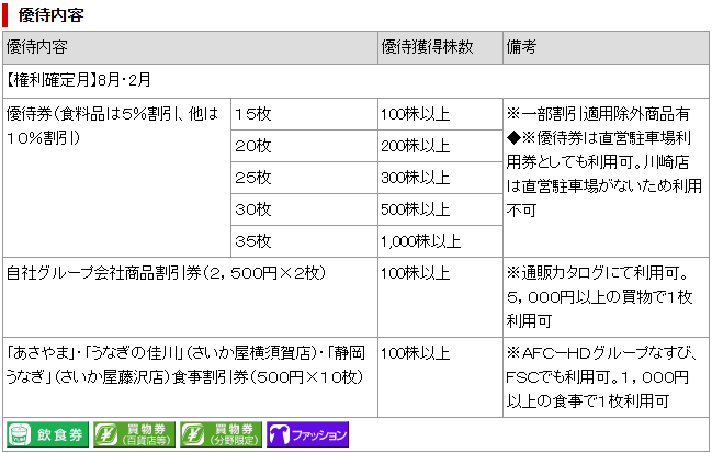 神奈川県を中心に百貨店事業を展開する老舗企業です。現在は、健康食品メーカーのAFC-HDアムスライフサイエンス(2927)の傘下にあります。自社店舗にて利用可能な「株主お買物優待券」などが進呈されます。