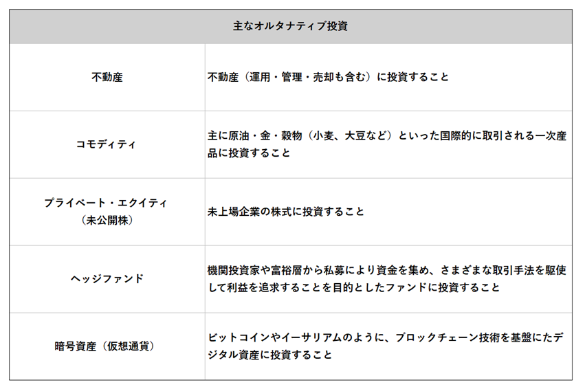 不動産、コモディティ、ヘッジファンド、プライベート・エクイティ、暗号資産など対象も形態も多様なため、投資の戦略やタイミングの判断が難しくなります。「話題だから」という理由で投資すると、目的やリスク許容度とミスマッチを起こしやすくなるため注意が必要です。