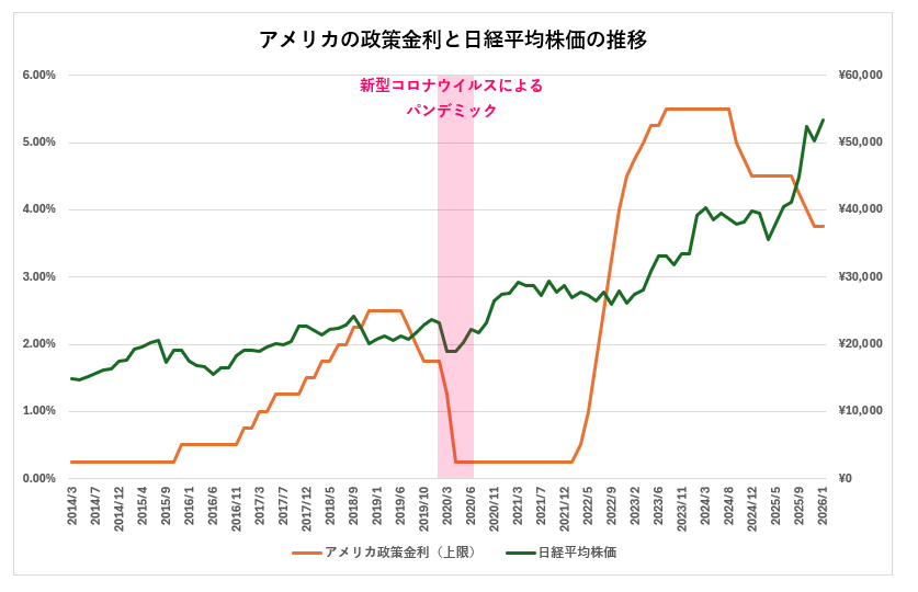 アメリカの政策金利は上限値を、日経平均株価は各月の最終営業日の終値を記載。