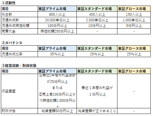 - 流動性の基準:一定の株主数や売買代金など、取引の活発さに関する条件