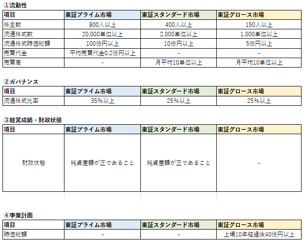 ※実際の上場基準では、複数の選択肢や詳細な条件が設けられていますが、本表では代表的な項目のみ記載しています。より詳細な条件を確認するには、最新の情報をご確認ください。