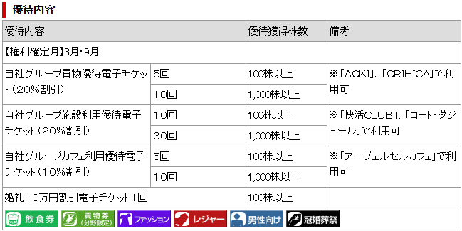日頃から 「AOKI」や「ORIHICA」での買い物が多い方や、快活CLUB・コート・ダジュール をよく利用する方にとっては、使いやすくお得感の大きい優待内容です。