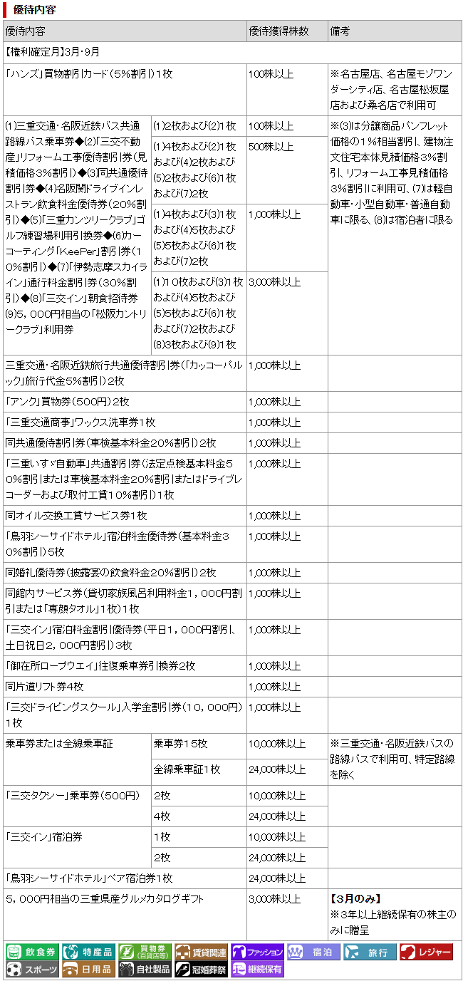 株主優待は、三重交通・名阪近鉄バス共通路線バス乗車券や、「三交不動産」リフォーム工事優待割引券(見積価格3%割引)が受け取れます。