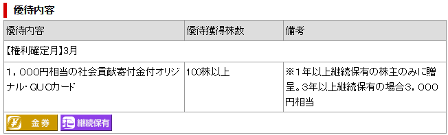 優待内容は100株以上かつ1年以上継続保有で1,000円相当の社会貢献寄付金付オリジナルQUOカードが受けられます。