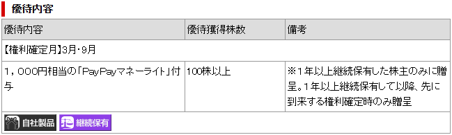 優待内容は1年以上継続保有でPayPayマネーライト1,000円分です。