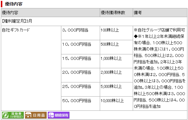 保有株数、継続保有年数に応じて受けられるギフトカードの内容が割増しされます。