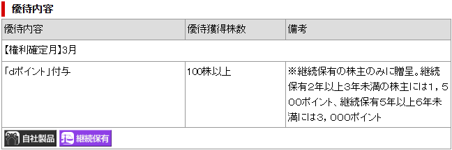 優待内容は100株以上かつ継続保有2年以上で『dポイント』が付与されます。