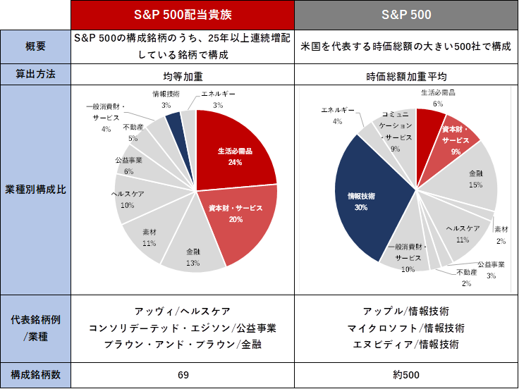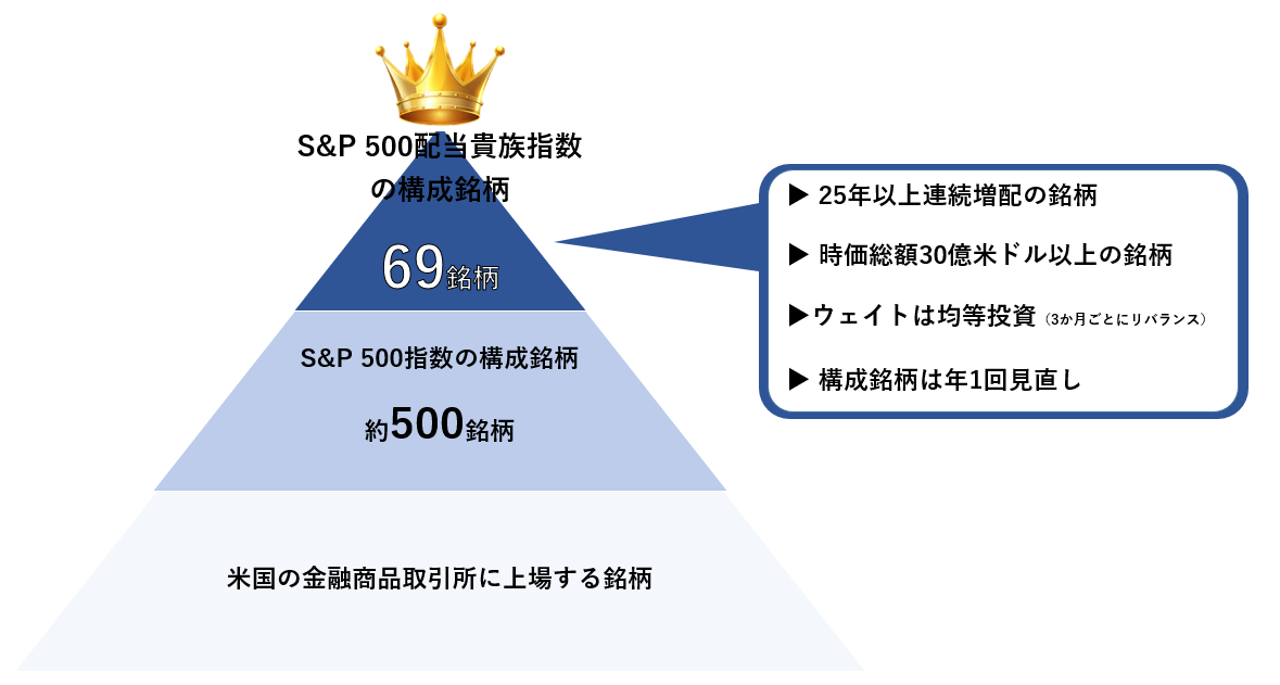 「S&P 500配当貴族指数」はS&P 500指数の構成銘柄の中から25年以上連続して配当を増やし続けてきた大型優良株を厳選して構成された指数です。