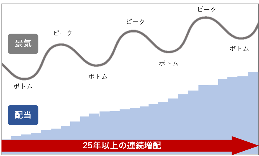 経済は好景気と不景気を繰り返す中で成長しますが、25年以上にわたり配当を増やすためには、安定した収益と健全な財務状況が必要不可欠です。