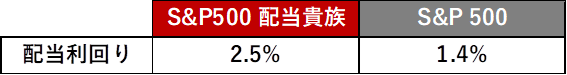 S&P 500配当貴族指数の予想配当利回りは、S&P 500指数と比較すると高いものの一般的に高配当と呼ばれる3%~の利回りには達していません。