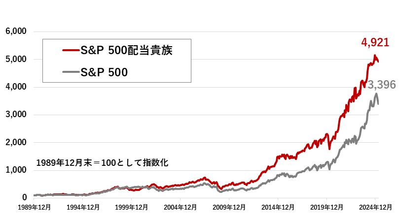 S&P 500配当貴族指数の算出が開始された1989年12月からのパフォーマンスを見ると、S&P 500指数を大きく上回っています。増配企業で構成されたS&P 500配当貴族指数は、その安定した配当がパフォーマンスの下支えとなっていると考えられます。