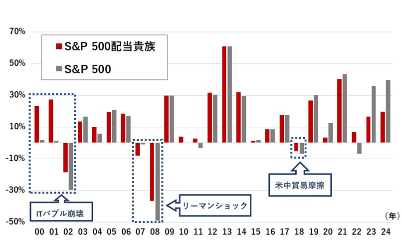 毎年のリターンを比較すると、S&P 500配当貴族指数は相場の下落局面においてS&P 500指数よりも下落幅が少ない傾向があります。この下落局面での強さが長期での良好なパフォーマンスに繋がっています。