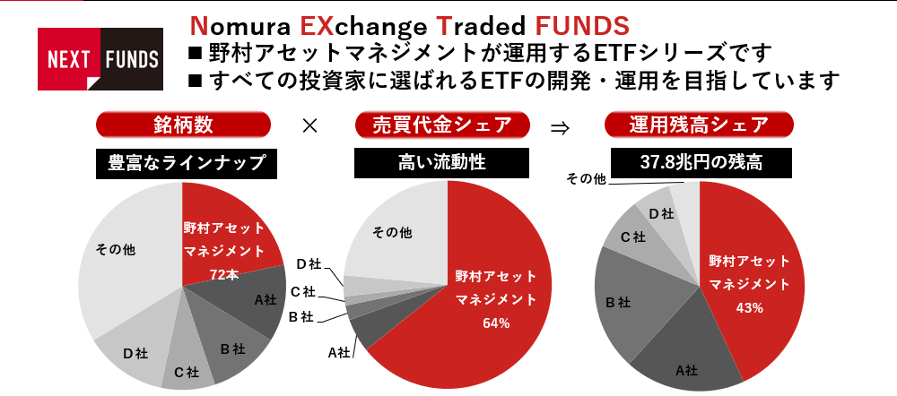 「NEXT FUNDS」とは日本国内のETFにおいて銘柄数・売買代金・運用残高でシェアNo.1を誇る、野村アセットマネジメントが運用するETFシリーズです。