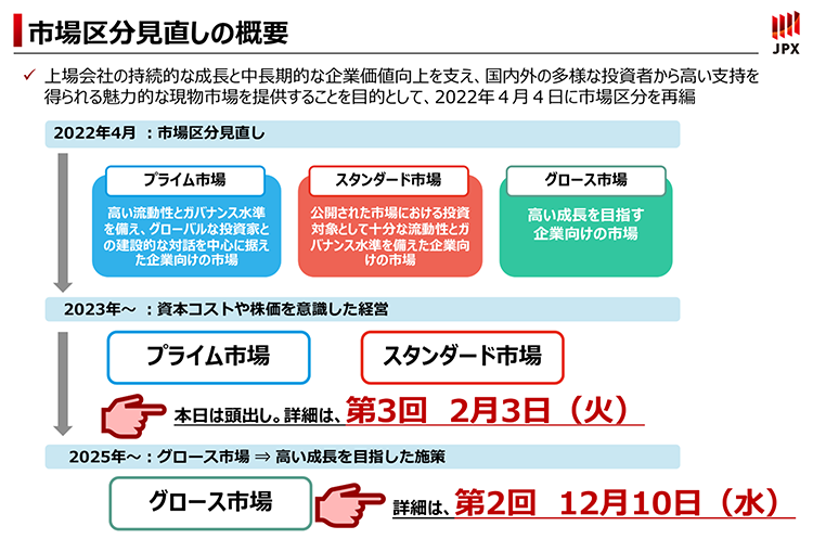 東証改革の、一つの節目は「市場区分の見直し」だと思います。それまでは東証一部・二部・マザーズ・ジャスダックがありましたが、2022年4月に、プライム市場、スタンダード市場、グロース市場という3つの市場に区分としました。